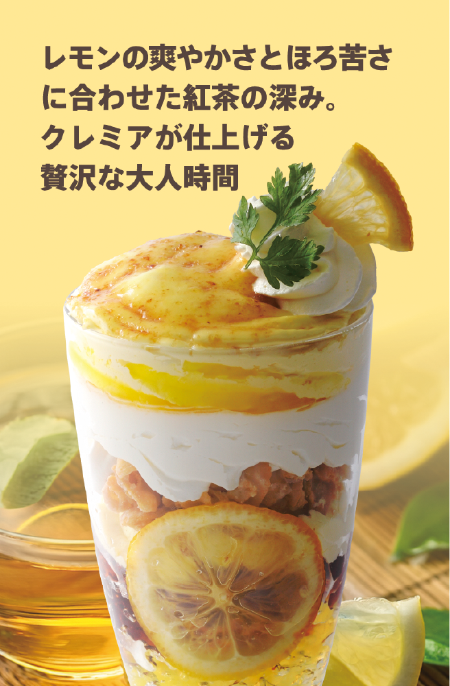 レモンの爽やかさとほろ苦さに合わせた紅茶の深み。クレミアが仕上げる贅沢な大人時間をお楽しみください。 -